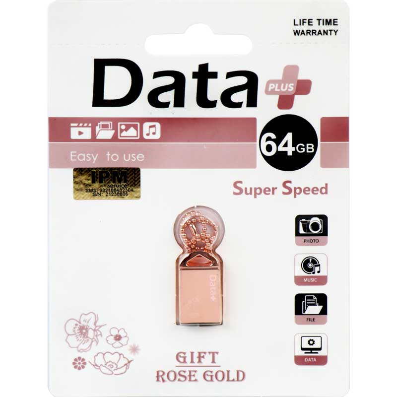 فلش مموری دیتا پلاس مدل گیفت یک فلش مموری ساده و کوچک با ظاهری زیبا بوده که کمپانی دیتا پلاس آن را طراحی و ساخته است، و دارای ۶۴ گیگابایت حافظه می باشد و باعث می شود بتوانید تعداد زیادی فیلم با کیفیت بالا در آن ذخیره و نگهداری نمایید. جنس بدنه فلش فلزی می باشد و مقاومت بالایی در برابر رطوبت، شوک و گرد و غبار دارد و می تواند به خوبی از اطلاعات مهم کاربران محافظت نماید. به بدنه فلش مموری دیتا پلاس بندی متصل شده است که برای اتصال به جاسوئیچی طراحی شده است تا بتوانید آن را در همه جا همراه خود داشته باشید. این فلش مموری برای انتقال اطلاعات خود از رابط USB 2.0 پشتیبانی می نماید که متاسفانه با رابط های پر سرعت USB3.0 سازگاری ندارد و می تواند اطلاعات را با سرعت ۴۸۰ مگابیت بر ثانیه انتقال و یا جا به جا نماید.