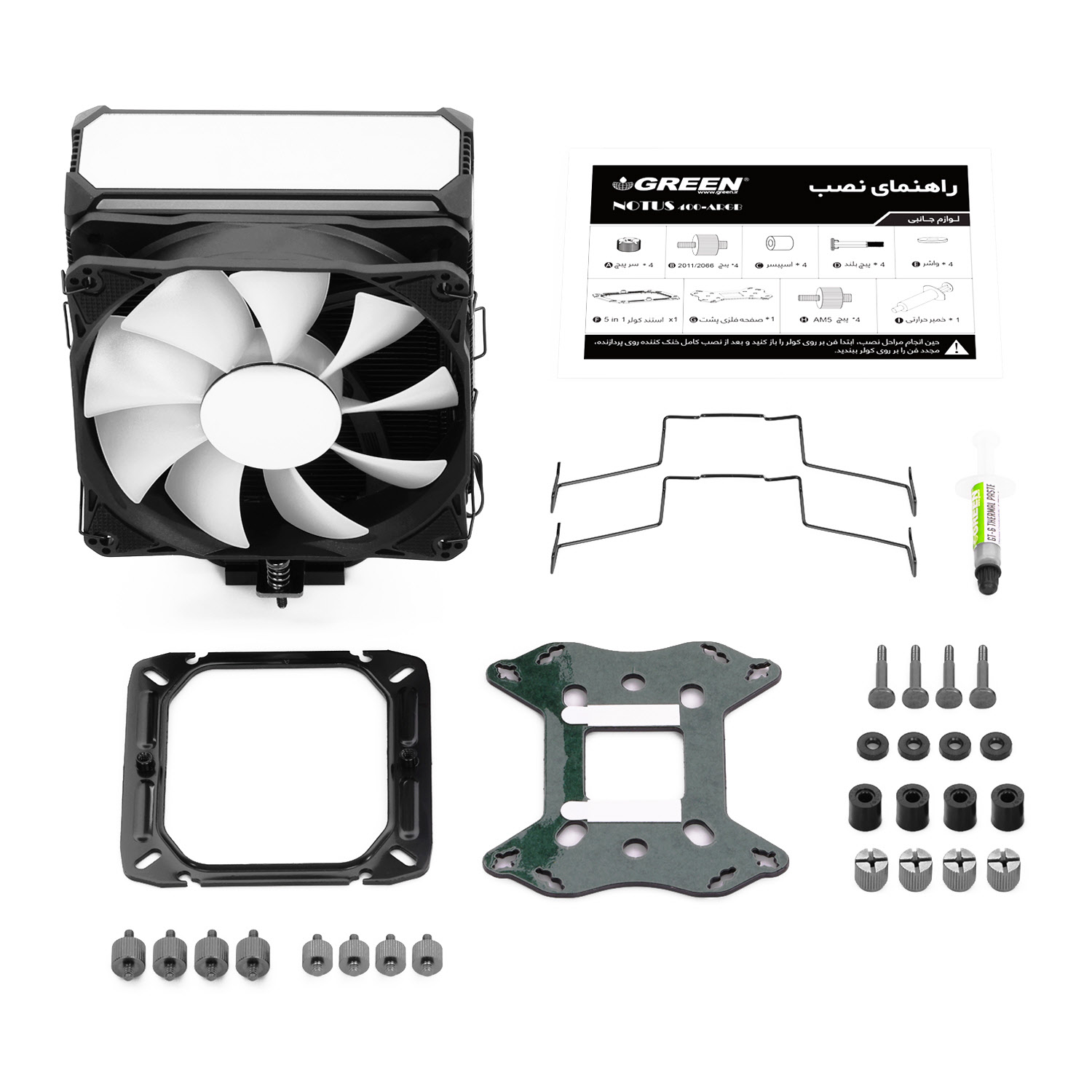 کولر بادی NOTUS 400-ARGB گرین با اتکا به ۴ هیت پایپ مسی با قطر 6mm و تکنیک تماس (Heat-Pipe Direct Touch (HDT، بیش از ۴۸ تیغه آلومینیومی مشکی آنادایز شده، فن قدرتمند 1800RPM فوق العاده کم صدا و بادوام، نورپردازی ARGB فن و بخش فوقانی از نوع Infinity Mirror در کنار وزن کم و نصب و راه اندازی آسان آماده میزبانی از مدرن ترین پردازنده های دسکتاپ گیمینگ و سرور حال حاضر بازار خواهد بود