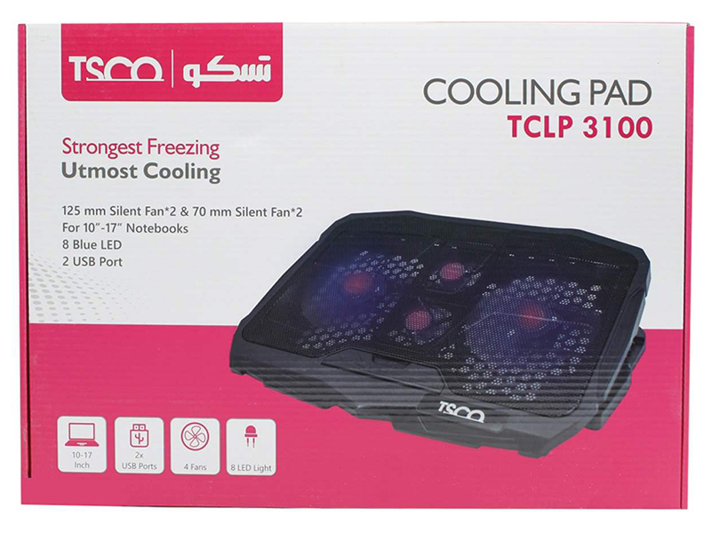 پایه خنککنندهی «تسکو» مدل «TCLP 3100» یکی از قویترین کولپدهاست و چهار عدد فن دارد. در این پایه دو عدد فن با قطر ۱۲۵ میلیمتری به کار رفته و ۲ عدد فن کوچکتر با قطر ۷۰ میلیمتر هم در آن وجود دارد. این مدل از پایه خنککنندههای تسکو ۳۹ سانتیمتر طول دارد. عرض آن ۲۸ سانتیمتر و ضخامت پایه هم ۲٫۸ سانتیمتر است. بنابراین این مدل از پایه خنک کنندههای تسکو برای لپتاپهای ۱۷ اینچی و کوچکتر از آن مناسب خواهد بود. این کول پد ۷۷۰ گرم وزن دارد و با استفاده از فلز و پلاستیک ساخته شده است. به گفته ی شرکت تولید کننده سرعت فنهای بهکار رفته در این پایه ۱۵۰۰ دوربر دقیقه است. بنابراین میتوان گفت این چهار فن نقش خوبی در انتقال هوا به زیر لپتاپ شما خواهند داشت و باعث میشوند دستگاه در حین کار کردن داغ نشود. کار کردن با لپتاپ یا سایر تجهیزات الکترونیکی، سبب بالا رفتن دمای آنها میشود. این افزایش دما بر عملکرد دستگاه تاثیر منفی میگذارد. اگرچه فن داخل لپتاپ گرمای تولید شده توسط «CPU» را خارج میکند و تا حدودی دما را پایین میآورد، اما بهتر است هوایی که به داخل کشیده میشود، هوایی تازه باشد نه همان هوایی که توسط فن «CPU» به خارج فرستاده شده است. به همین دلیل لازم است تا توسط یک وسیله خارجی، هوای خنکتر، از اطراف لپتاپ به فضای زیر آن کشیده شود. پایههای خنککننده یا کول پدها فاصلهای بین لپتاپ و سطحی که روی آن قرار میگیرد ایجاد میکنند و به کمک فن یا فنهایشان، جریانی از هوا را به زیر لپتاپها هدایت میکنند. بهاینترتیب نقش موثری در پایین آوردن دمای لپتاپ دارند. تسکو برای فنهای بهکار رفته در این کولپد نشانگرهای LED با رنگ آبی قرار داده تا با استفاده از آنها وضعیت خنککننده مشخص شود.