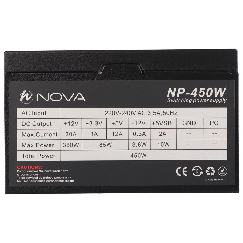 پاور نوا Nova NP-450W برند نوا از نوع غیر ماژولار بر اساس فرم فاکتور ATX طراحی شده است که برای انواع سیستم ها با مادربردهای اندازه استاندارد مناسب می باشد. این منبع تغذیه با بهره بردن از متریال و قطعات با کیفیت و استانداردهای حفاظتی OVP ،OPP و UVP، امنیت قطعات داخلی سیستم را تامین می کند. اتصالات این منبع تغذیه شامل دو عدد کانکتور IDE، چهار عدد کانکتور SATA، یک عدد کانکتور ۴+۴ پین، یک عدد کانکتور ۲+۶ پین و یک عدد کانکتور ۴+۲۰ پین مادربرد می باشد. یک فن ۱۲۰ میلی متری نیز بر روی این منبع تغذیه تعبیه شده که فرآیند خنک سازی و متعادل سازی دما را به خوبی اجرا نموده و از آسیب ناشی از فشار بار اضافی و گرمای بیش از حد به قطعات داخلی جلوگیری می کند.