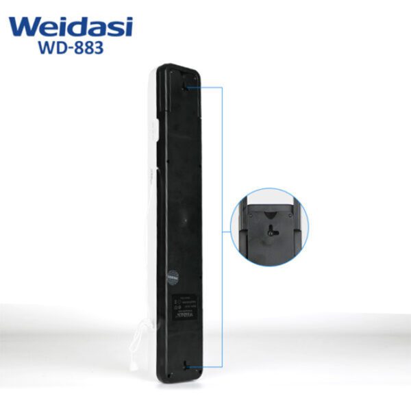 چراغ اضطراری دیواری شارژی ویداسی مدل WD-883 یک محصول کاربردی با طراحی شیک و مقاوم است که برای روشنایی در شرایط اضطراری طراحی شده است. بدنه این چراغ از جنس پلاستیک ABS مقاوم و به رنگ سفید ساخته شده و دارای ۶۰ عدد لامپ SMD LED است که نوری سفید و یکنواخت تولید میکند. این چراغ با دو عدد باتری لید اسید کار میکند و ورودی آداپتور آن ۶ ولت و ۱ آمپر است. برای عملکرد بهینه، مدت زمان شارژ اولیه ۱۲ ساعت توصیه میشود.